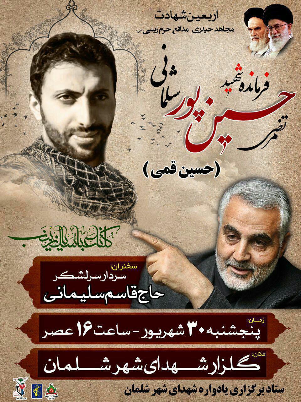 سردار قاسم سلیمانی سخنران ویژه مراسم چهلم شهادت شهید مدافع حرم مرتضی حسین پور شلمانی خواهد بود.