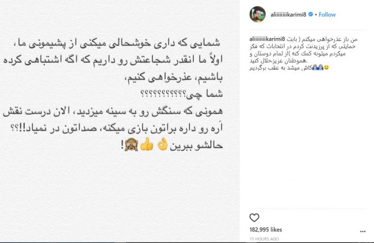 او پس از لحظاتی با انتشار پست دیگری به منتقدین خود که او را حامی حسن روحانی می خواندند واکنش نشان دادو گفت اشتباهش را می پذیرد و از رای دادن به روحانی پشیمان است.