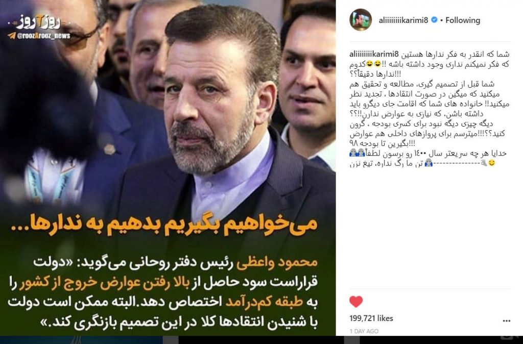 علی کریمی در واکنش به اظهارات رییس دفتر رییس جمهور که گفته بود عوارض خارج از کشور به ندارها اختصاص می یابد این چنین نوشت: