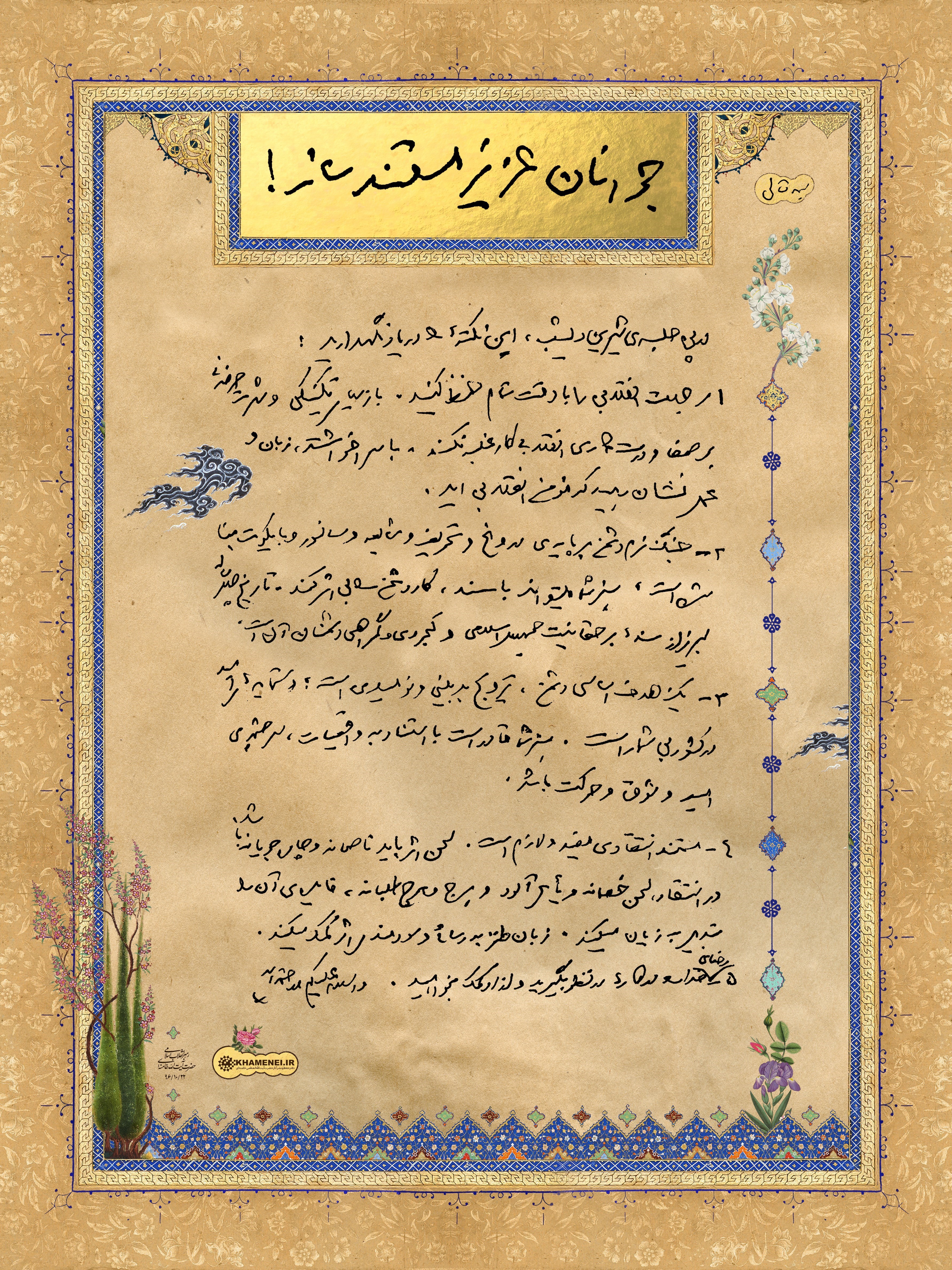 ۱ ــ جهت انقلابی را با دقت تمام حفظ کنید، بازی‌های تکنیکی و شهرت حرفه‌ای بر صفا و درست‌کاری انقلابی کار غلبه نکند، با سرِ افراشته‌، زبان و عمل نشان دهید که مؤمن و انقلابی‌اید.