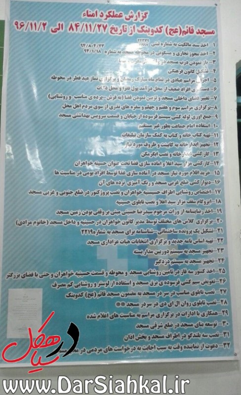 در این مراسم سید مصطفی حسینی به‌عنوان رئیس و حمیدرضا افروز، بهمن کشتکار و فریدون امانی به‌عنوان اعضای هیئت‌امنای مسجد حضرت قائم (عج) کدوبنک معرفی شدند.
