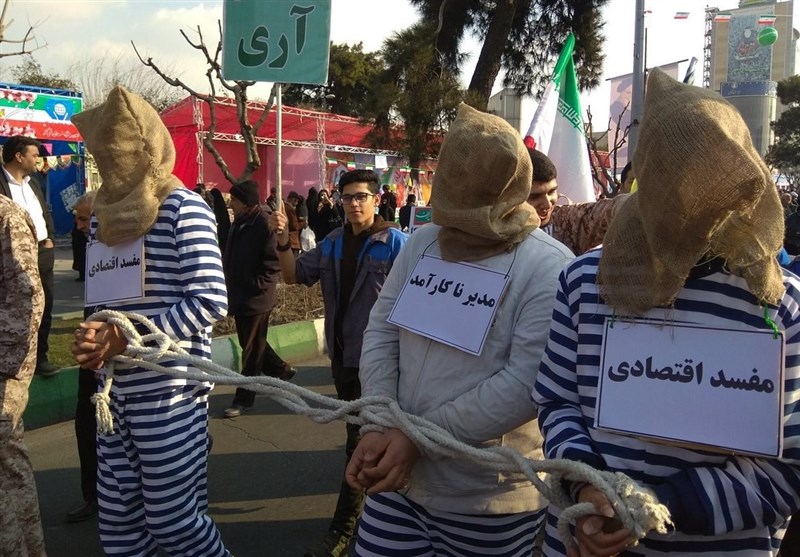 راهپیمایان امروز تهران ۲ مفسد اقتصادی و یک‌ مدیر ناکارآمد را به صورت نمادین دستگیر کردند.