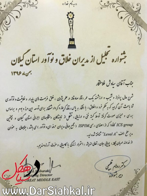 جناب آقای پورفسور سیاوش فلاحتکارانتخاب شایسته شما در جشنواره تجلیل ازمدیران خلاق ونوآور استان گیلان بهمن ۱۳۹۶ بعنوان مدیر سطح الف LEVEL A که از طرف کمیته فنی وارزیابی کیلان وهمچنین LCS group کانادا انتخاب گردیده به شما تبریک گقته . افتخاری برای سیاهکل وایران هستید ، همیشه پایدار وسرافراز باشید.