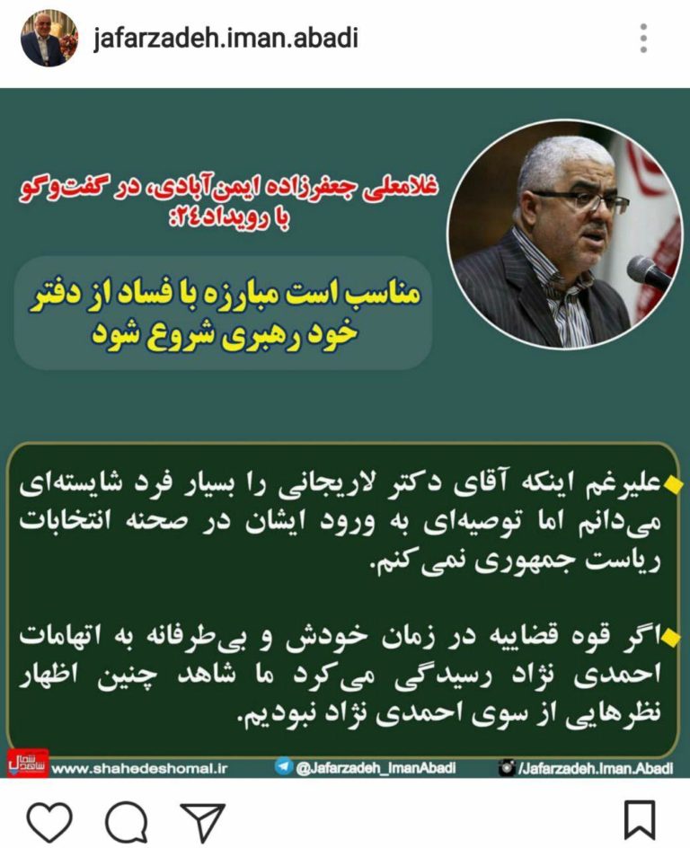 جعفرزاده در پیام توضیحی خود درباره مصاحبه با رویداد ۲۴ می نویسد: اینجانب (جعفرزاده ایمن آبادی- نماینده مجلس) چندی پیش مصاحبه ای با یکی از رسانه ها داشته که به دلیل «ضیق وقت» به یک باره و بدون  مقدمه چینی به اصل موضوع پرداخته و اشاره کردم که مبارزه با فساد از سوی دفتر رهبری شروع شود و سپس کلیه قوا به تفکیک اقدام کرده و گزارش آن را به ملت ارائه نمایند که ظاهرا مورد سوءاستفاده رسانه ها و کانال های معاند نظام و انقلاب قرار گرفته است!
