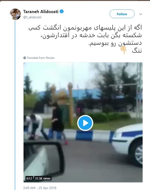 ویدئویی در شبکه‌های اجتماعی منتشر شد که در آن ۴ مأمور راهنمایی و رانندگی در حال ضرب‌وشتم یک جوان هستند. این کلیپ در صفحه ترانه علیدوستی منتشر شد و وی با حمله به مأموران راهنمایی و رانندگی نوشت “اگه از این پلیسهای مهربونمون انگشت کسی شکسته بگن بابت خدشه در اقتدارشون، دستشون رو ببوسیم”.